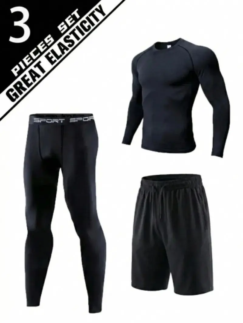 Muški sportski set od 3 komada koji se sastoji od majice sa dugim rukavima, helanki i šortsa. Opremljen je elastičnim pojasom za prijanjanje, brzim sušenjem i prozračnošću, što ga čini idealnim za vežbanje u teretani ili trčanje.