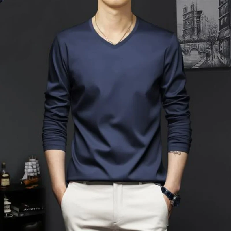 Ovo je novi prolećni promotivni proizvod – Ice Silk majica sa dugim rukavima za muškarce u korejskom casual stilu. Ova tanka, V-izrez majica je veoma svestrana i savršena za modno osvešćene muškarce koji žele da izgledaju elegantno i profinjeno. Sa modernim dizajnom i kvalitetnim materijalom od svile, ova majica je savršen izbor za svakodnevni izgled u gradu.