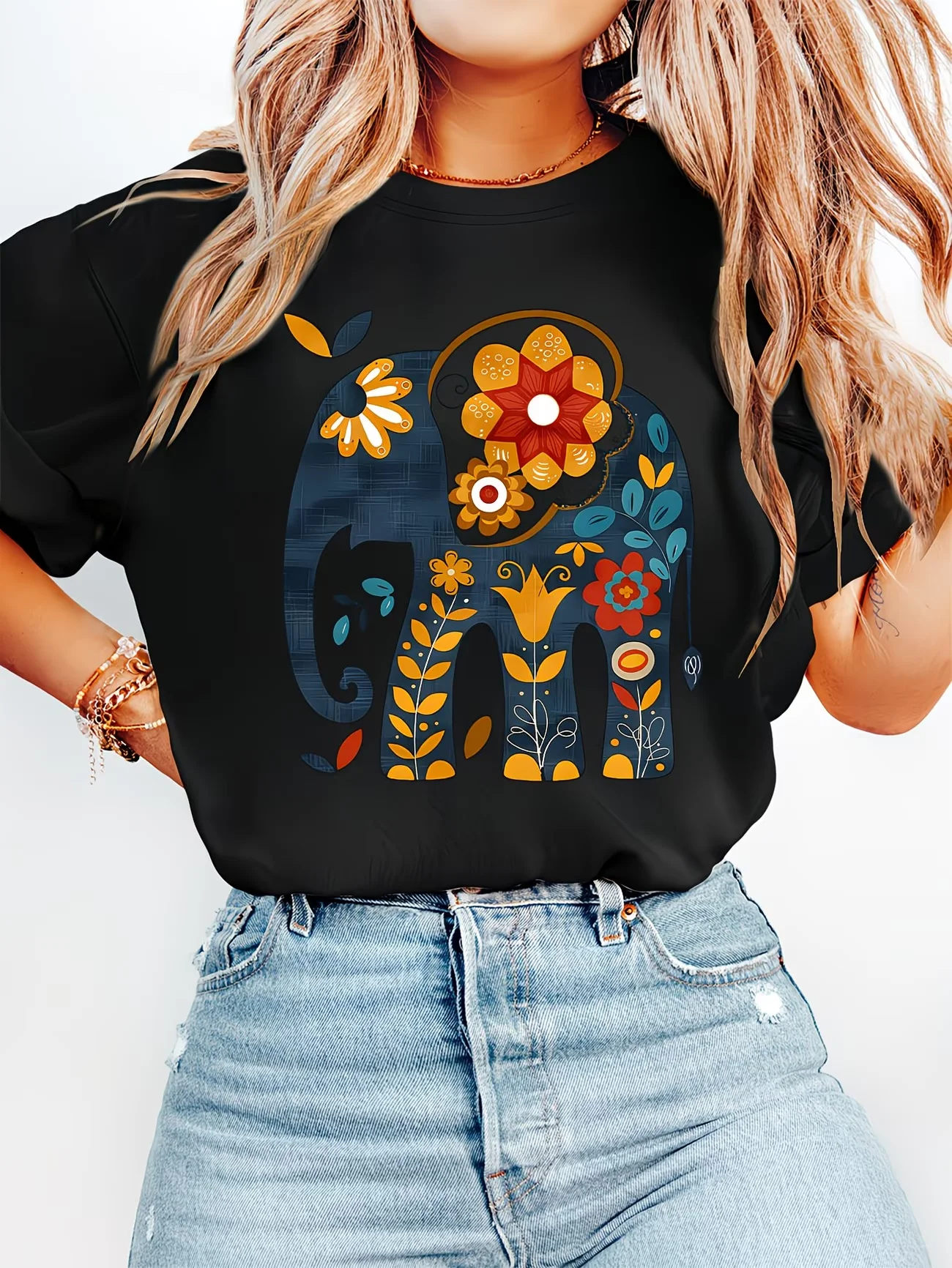 Ženska majica sa boho stilom i printom slona – mekog okruglog izreza i kratkih rukava, sa živopisnim dizajnom slona i cvetova.