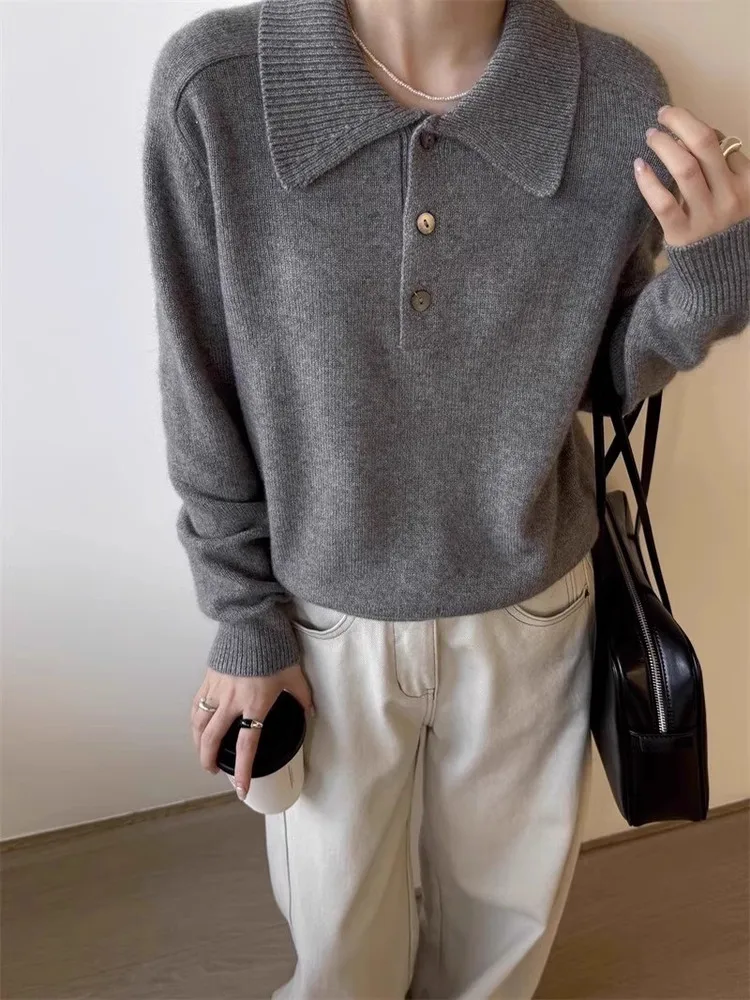 Džemper sa polu-otvorenim polo okovratnikom od 100% kašmira za žene, labavo krojen, idealan za opušteni, univerzalni izgled koji se može kombinovati uz različite odevne komade.