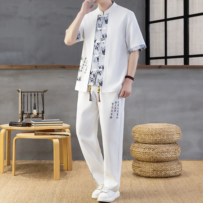 Kineski stil muškog trenerke, casual sportski kompleti za trčanje koji uključuju majicu sa kratkim rukavima i duge pantalone. Ova sportska odeća je savršena za letnje aktivnosti i pruža udobnost i stil u isto vreme.