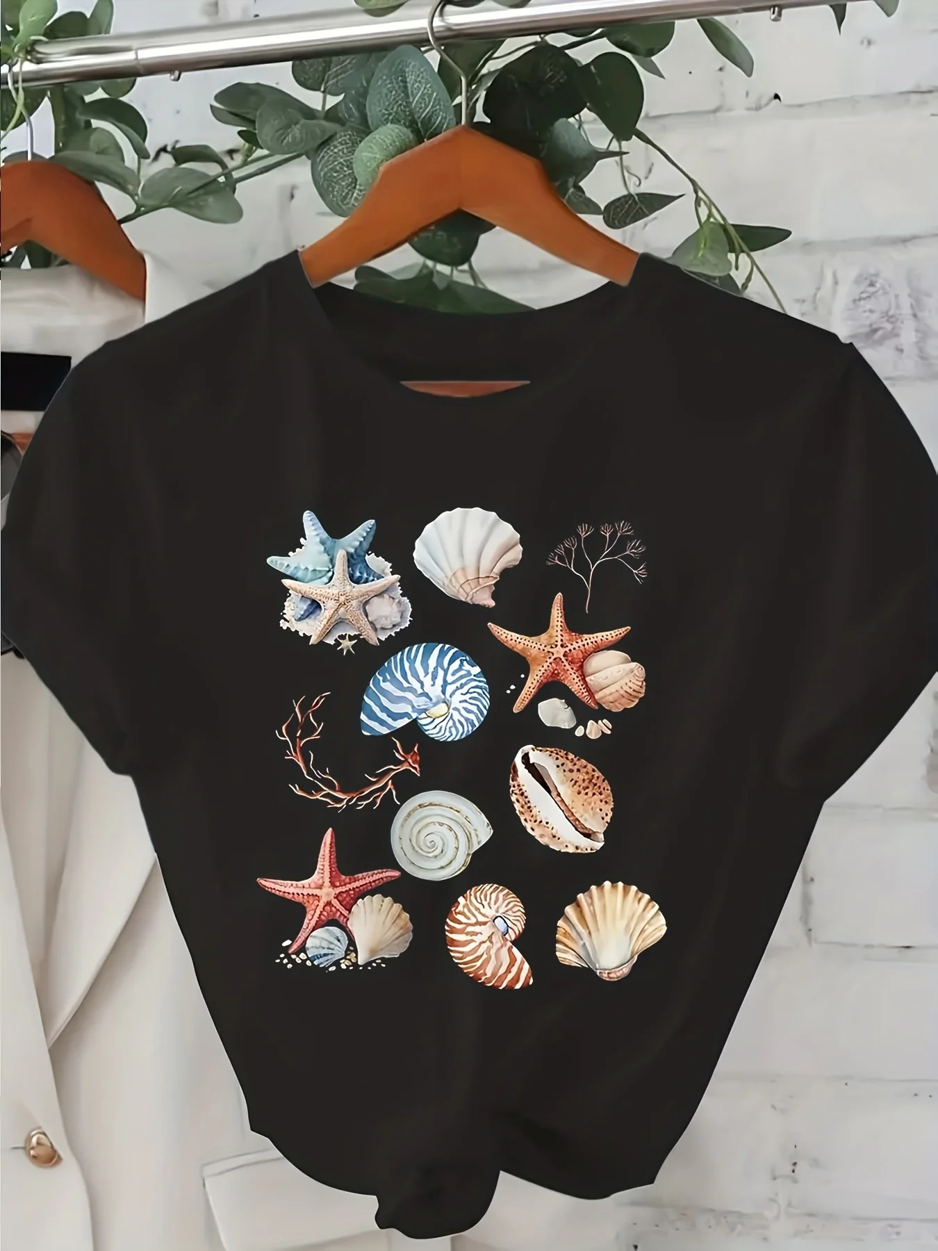 Ova lagana majica za plažu sa školjkama, morskim zvezdama i koralnim grebenima, u svetlo bež boji, savršen je izbor za svakodnevno letnje nošenje. Sa okruglim izrezom i modernim dizajnom, ova majica će dodati estetski dodir vašem odevanju.