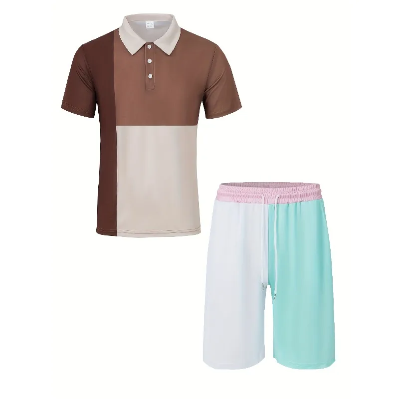 Muška letnja polo majica dvodelni set, sašiven od materijala u blok bojama sa štampanim detaljima, uključuje i raznovrsne šortseve. Ovaj set uključuje kratke rukave i može se nositi u različitim prilikama, od casual do trendi.