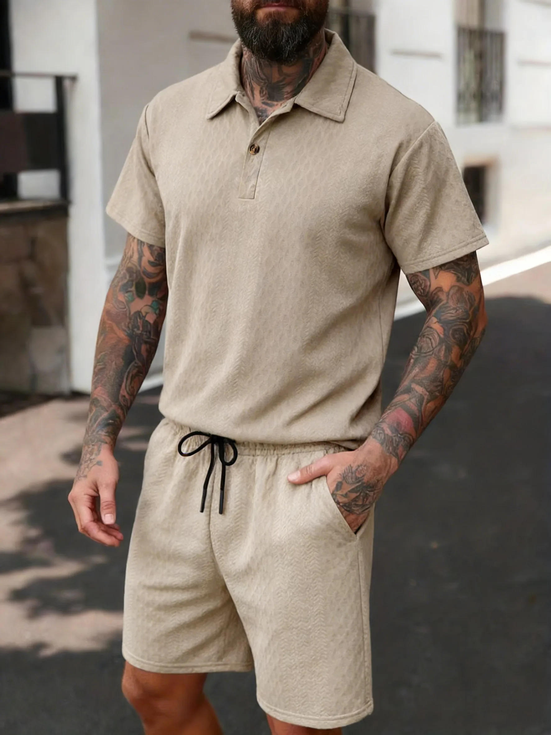 Kolekcija letnjih muških majica i šortseva u stilu plaže, u neutralnoj kaki boji. Polo majice sa otvorenim kragnama i šorts sa šarama od tkanja, idealni su za opuštene letnje dane na plaži. Lagani materijali i opušten kroj pružaju udobnost i slobodu pokreta tokom celog dana. Ova kombinacija je savršen izbor za letnji odmor ili vikend izlet.
