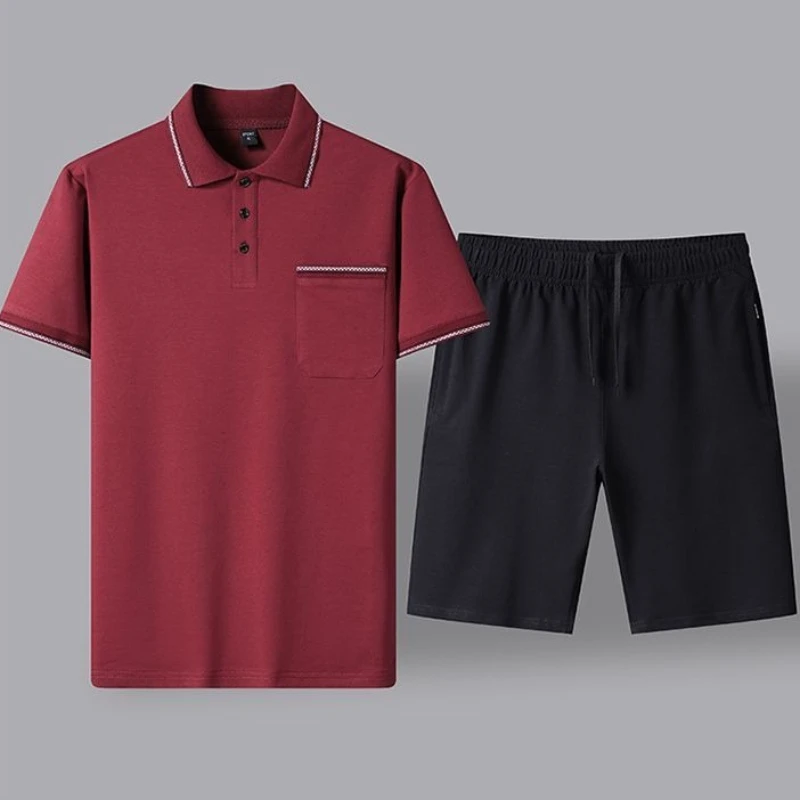 Stilizovan letnji muški kombinezon sa kratkim rukavima i okruglim ovratnikom, pogodan za sredovečne i starije očeve. Ovaj set je udoban i moderan izbor za tople letnje dane.