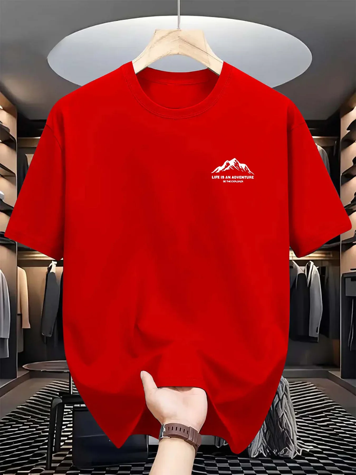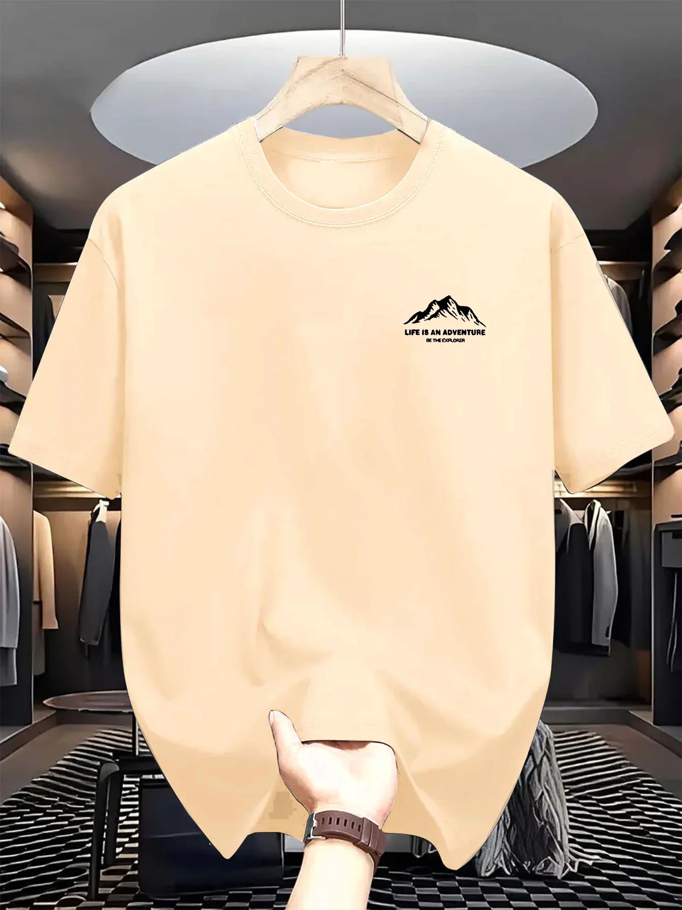 Muška letnja majica sa opuštenim krojem, izrađena od čistog materijala, sa udobnim okruglim izrezom i kratkim rukavima. Na njoj se nalaze štampana slova i planinski motivi.