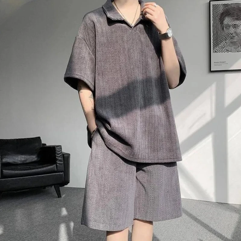 Muški moderan letnji set sa kratkim rukavima, uključujući polo majicu sa ukrasnim naborima i prateće šortseve, idealan za opušteni sportski stil.