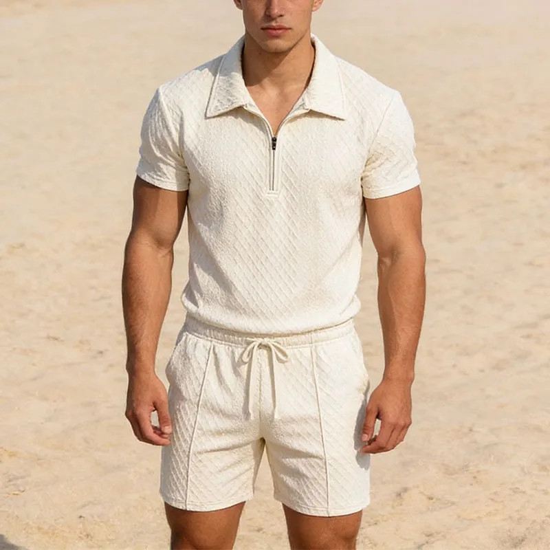 Muški polo setovi sa okruglim kragnama za leto, sa džakard uzorkom i polu-zipperom. Sastoji se od dva dela: polo majice sa kratkim rukavima i šortsa. Vintage stil za opušteni sportski look.