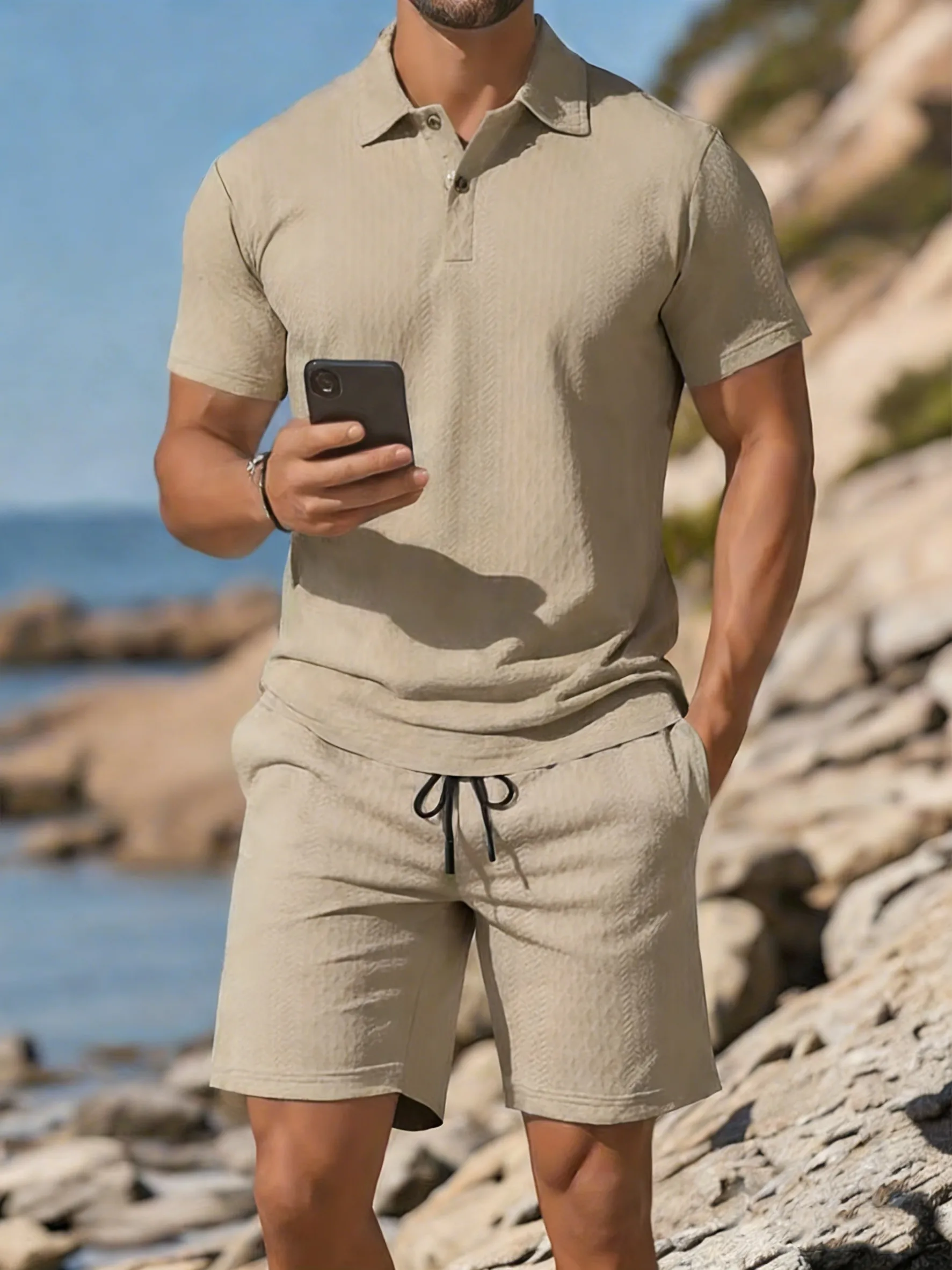 Ovaj set od dva dela uključuje mušku polo majicu sa kratkim rukavima i kratke pantalone od lagane i prozračne tkanine. Polo majica ima klasičan kroj sa okruglim izrezom na kragni, dok su pantalone šireg kroja sa ukrasnim šarama. Savršen je izbor za letnji odmor ili opušteno nošenje tokom toplih dana. Napravljen je od udobnog pamuka koji omogućava slobodu pokreta i prijatnost tokom nošenja. Ovaj set će vam pružiti moderan izgled i udobnost u isto vreme.