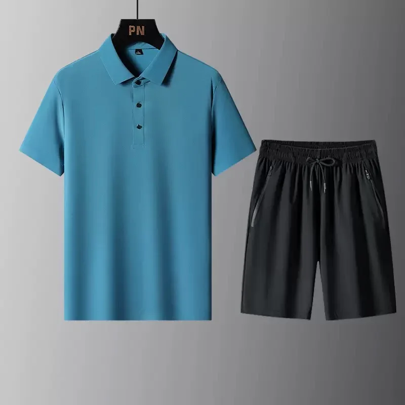 „Muški dvodelni set polo majice i šortsa u udobnoj i prozračnoj letnjoj modnoj boji. Savršen izbor za opušteni sportski stil u velikim veličinama.“