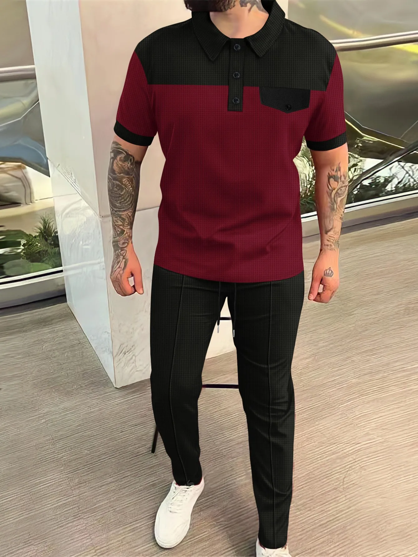 Dvodelni set za muškarce idealan za poslovne i casual prilike tokom proleća i jeseni. Sastoji se od košulje sa waffle tkanjem i blok bojom, kao i pantalona sa ukrasnim vezom. Udoban i moderan izbor za svakodnevnu garderobu.
