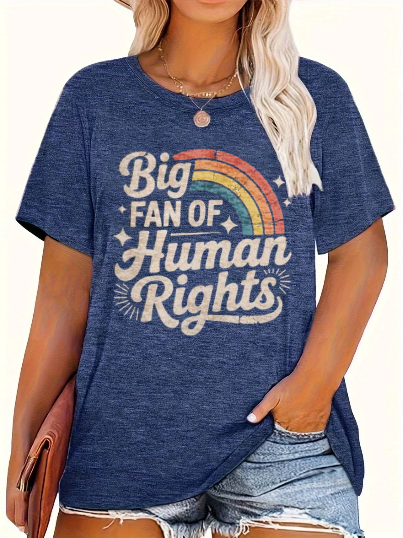Ova majica za žene sa retro duginim grafikom i plavom bojom je savršen izbor za sve one koji podržavaju ljudska prava. Sa udobnim krojem i modernim dizajnom, ova majica je idealna za svakodnevno nošenje i izražavanje važne poruke. Budi veliki fan ljudskih prava i nosi ovu majicu sa ponosom!