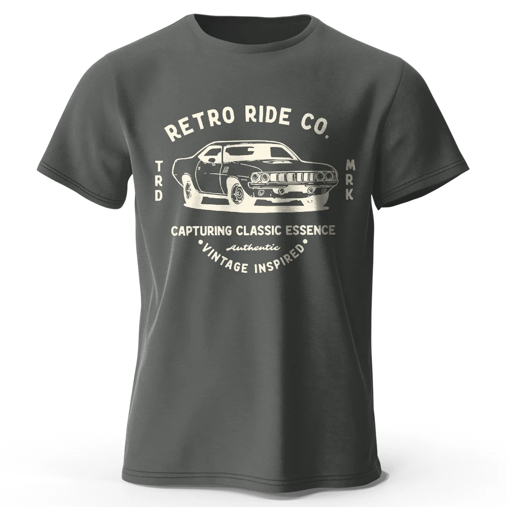 „Muška vintage majica sa automobilskim motivom, izrađena od 100% pamuka, u retro stilu, sa oversized krojem. Pogodna za muškarce i žene, savršen dodatak klasičnoj uličnoj odeći.“