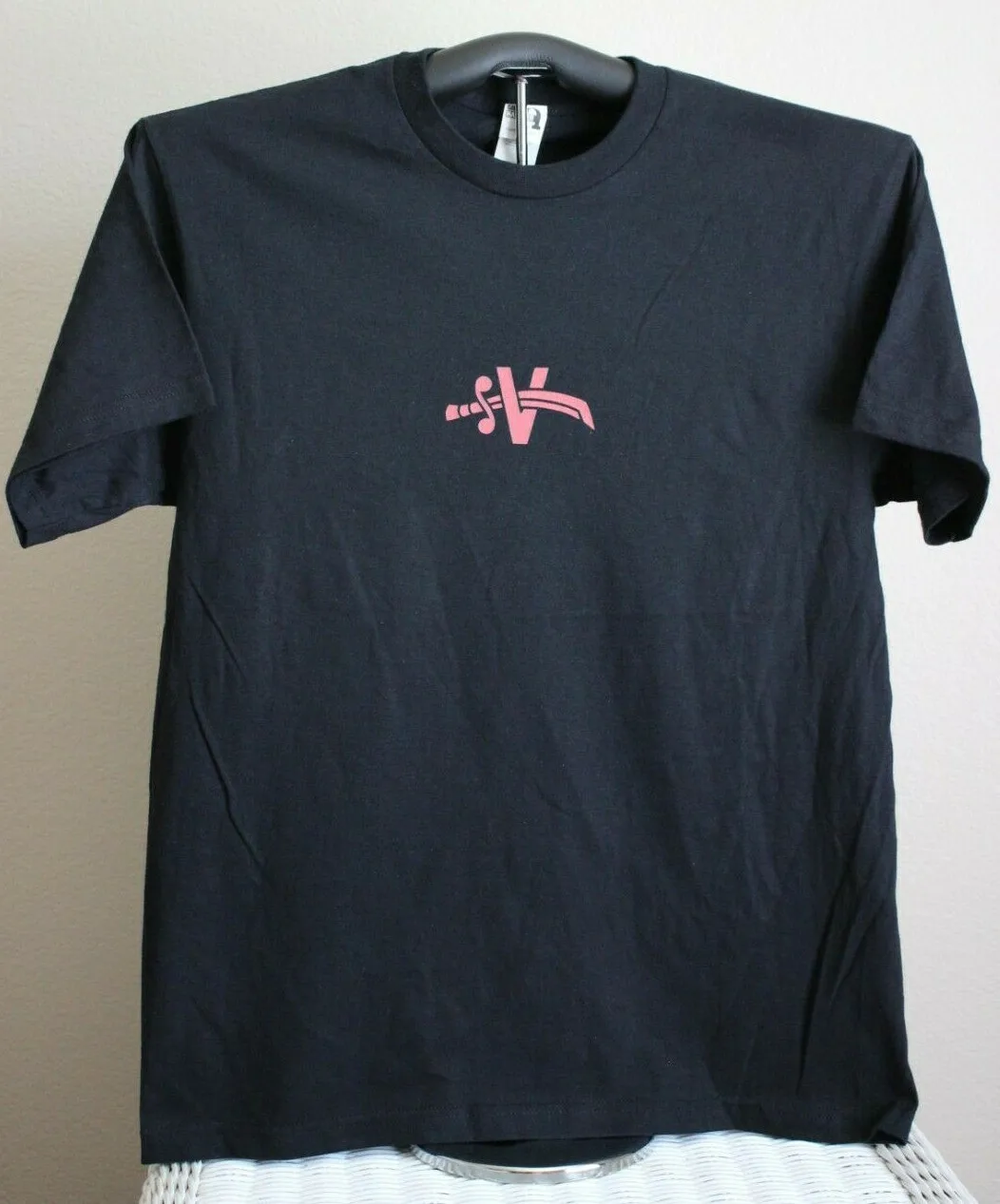 Crna majica sa grafikom mača koji seče slovo V u obliku pobedničkog znaka. Velika veličina majice.